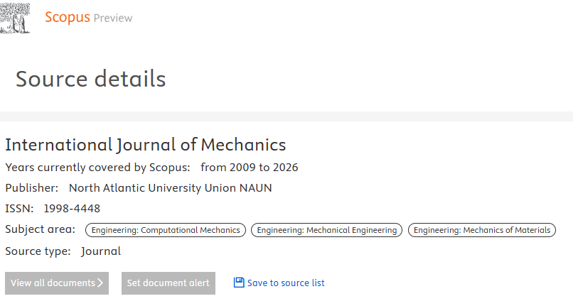 | Aims & scope | International Journal of Mechanics provides a specific medium for dissemination of high-quality research results in the various areas of theoretical, applied, and experimental mechanics of solids, fluids, structures, and systems where the phenomena are inherently non-linear. |